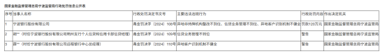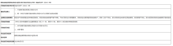 2024年11月22日,宁波银行因异地非持牌机构整改不到位、信贷业务管理不到位、异地客户识别机制不健全,被国家金融监督管理总局宁波监管局罚款120万元。时任宁波银行股份有限公司明州支行个人信贷和信用卡部信贷经理胡某、时任宁波银行股份有限公司远程银行中心总经理薛某被警告。
