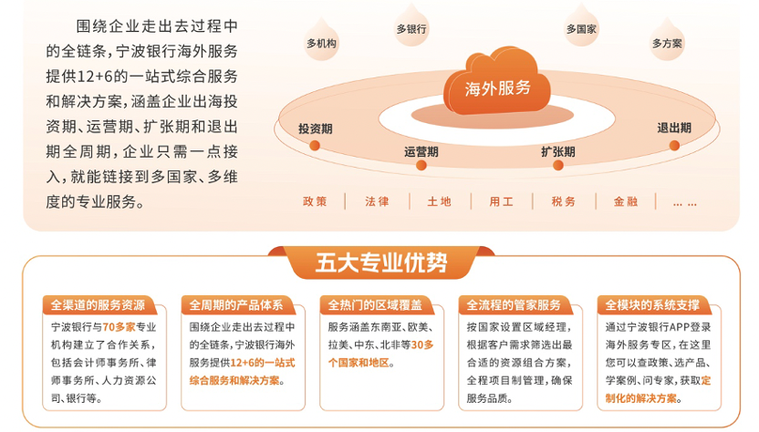 “海外服务”一站式平台,通过与境内外专业事务所、咨询公司、银行等机构合作,为企业提供海外投资、海外金融的全方位服务,目前合作机构总数已达70余家,能满足东南亚、欧美、拉美、中东、北非等30多个国家的投资服务需求。围绕企业走出去过程中的全链条,宁波银行海外服务提供12+6的一站式综合服务和解决方案,涵盖企业出海投资期、运营期、扩张期和退出期全周期,企业只需一点接入,就能链接到多国家、多维度的专业服务。
