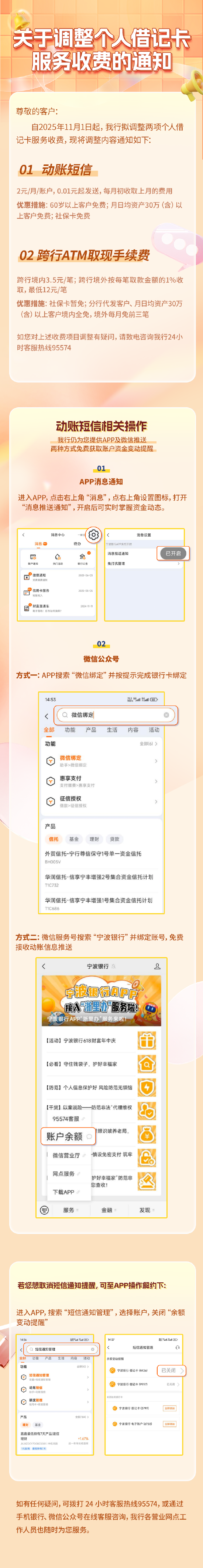 8月7日金融一线消息,宁波银行今日发布关于调整个人借记卡服务收费的通知。通知指出,自2025年11月1日起,宁波银行借记卡动账短信服务价格调整为2元/月/账户,0.01元起发送。60岁以上客户、月日均资产30万(含)以上客户、社保卡免费。