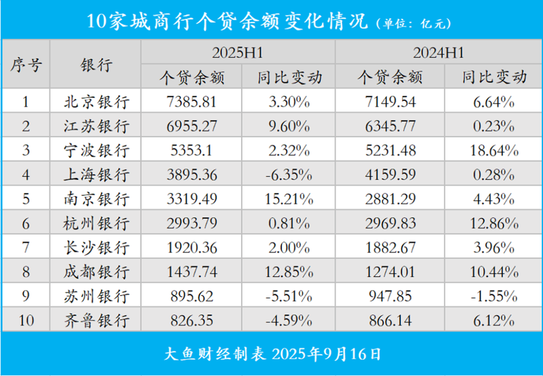 2025年上半年,除了北京银行、江苏银行、宁波银行个贷业务余额都达到了5000亿元以上。