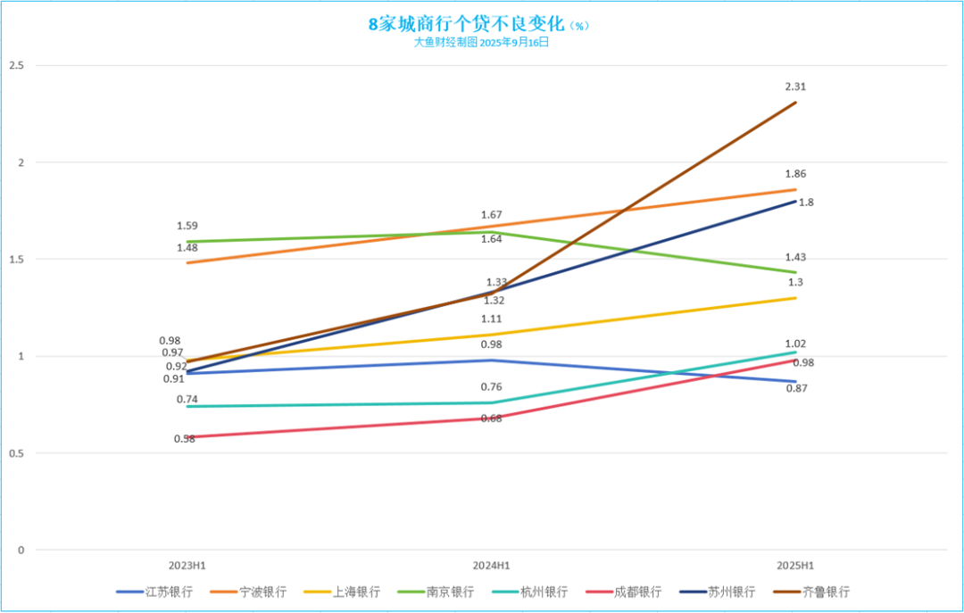 个贷不良最高的为齐鲁银行,上半年末达到了2.31%,同比上升0.99个百分点;其次为宁波银行、苏州银行,个贷不良贷款率分别为1.86%、1.8%。