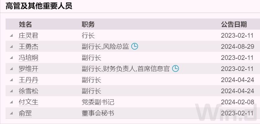 根据 万得 数据,加上付文生, 宁波银行 副行长增加到6位,其他5人分别是: 王勇 杰(兼任风险总监)、冯培炯、罗维开(兼任财务负责人和首席信息官)、 王丹 丹、徐雪松。