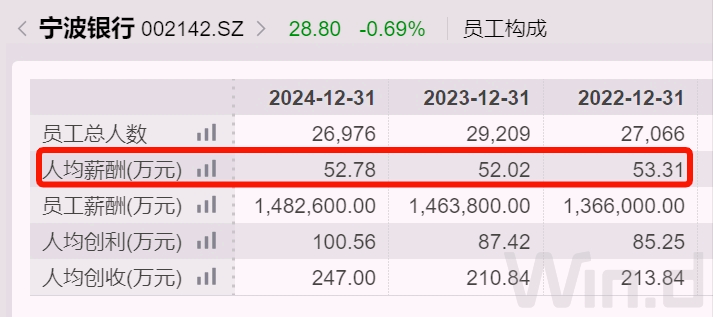 2024年末,该行职工人数大约2.7万,去年人均创利100.6万元,增加13万元;人均税前薪酬52.8万元,在上市城市商业银行中,位列第四。