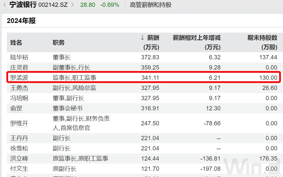 根据年报披露,罗孟波2024年税前薪酬为341万元,在高层中位列第三,次于董事长(373万元)和行长(359万元)。