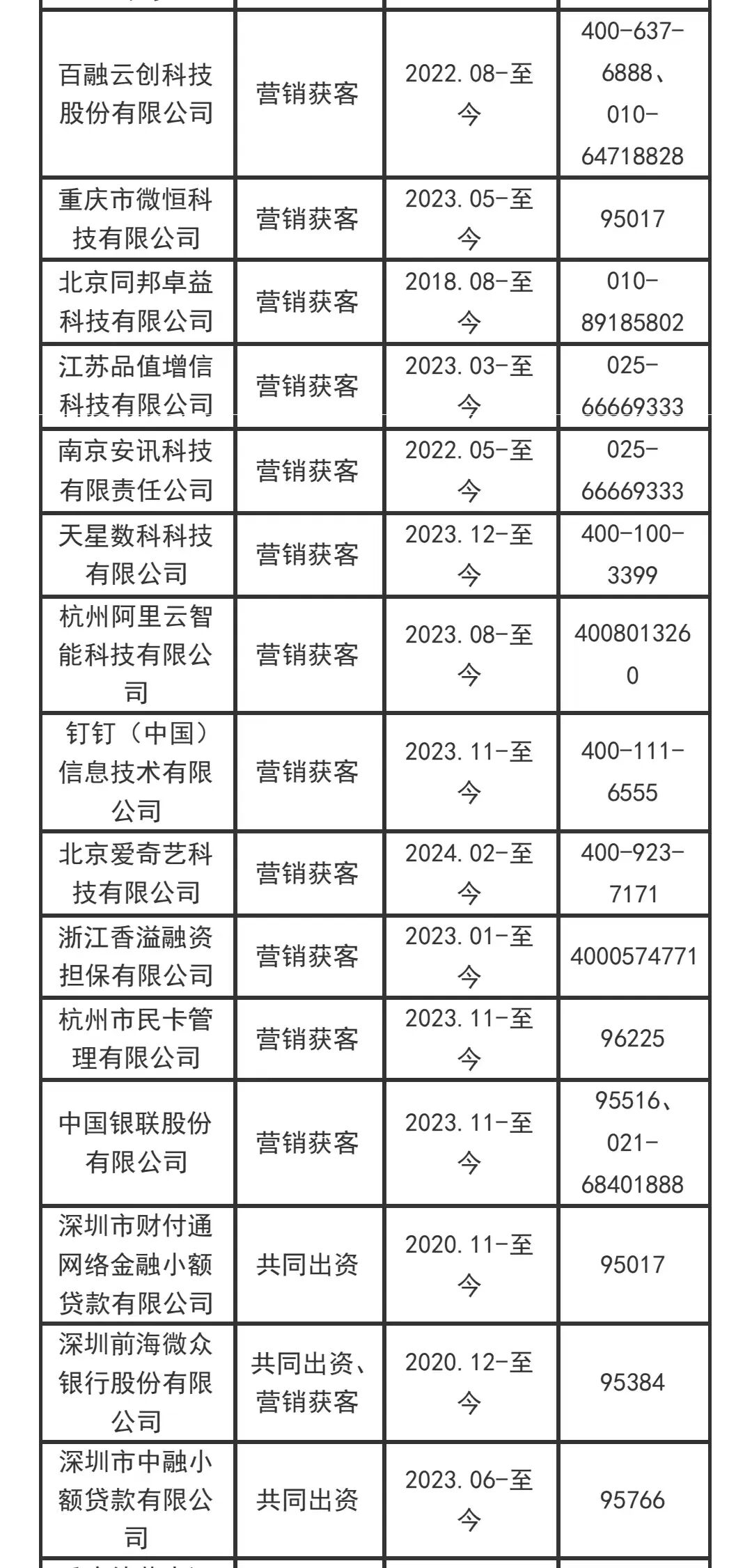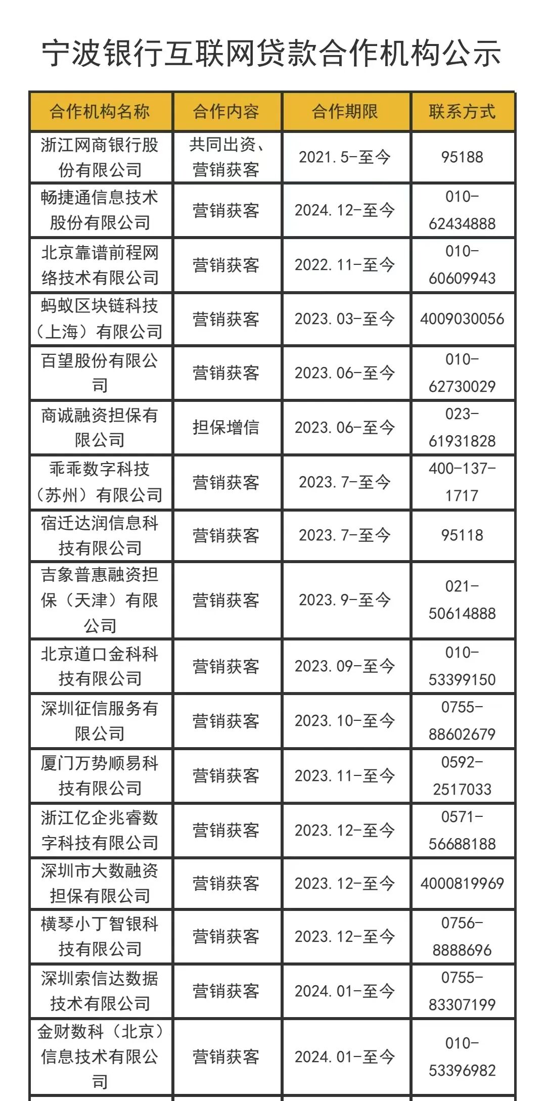 宁波银行 披露的互联网贷款合作机构名单显示,该行共与122家机构合作互联网贷款业务,具体包括: 网商银行 、 畅捷通 、办公逸、乖乖数科、道口金科、粤财征信、顺丰科技、中移金科、吉象普惠( 中国太平 旗下)、 找钢 网、 财付通小贷 、 唯品会 、 众安在线 、钉钉、 爱奇艺 、中国银联、 比亚迪汽车 、 华为 、 淘宝 闪购、 转转 等。