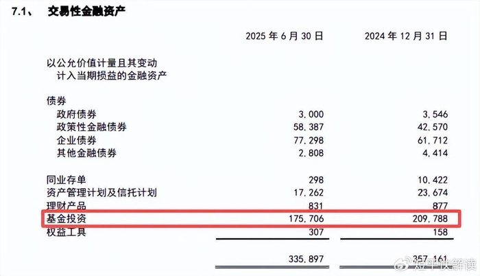 2025中报显示,交易性金融资产为3358.97亿元,较年初减少212.64亿元,下降5.95%,主要是基金投资减少所致,金额为1757.06亿元,较年初340.82亿元。
