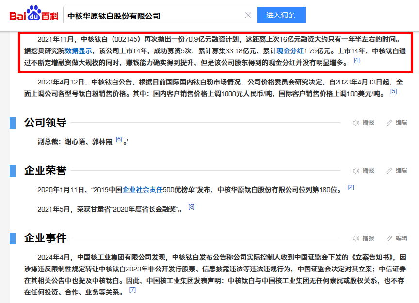 被问钱去哪了?中核钛白上市14年分红仅1.75亿