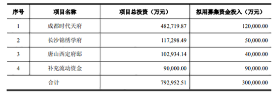 公告显示,荣盛发展拟定增募资不超过30亿元。扣除发行费用后,募集资金净额用于投资成都时代天府、长沙锦绣学府、唐山西定府邸,以及补充流动资金。