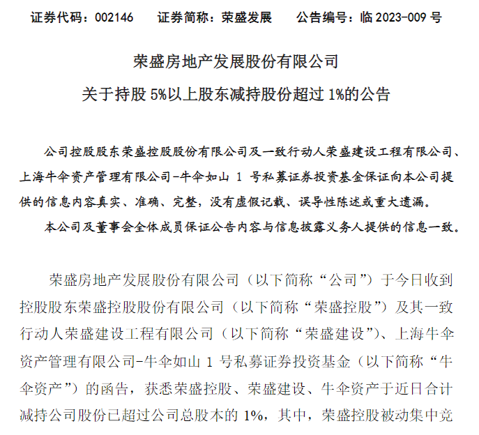 2月2日晚间,荣盛发展发布公告称,控股股东荣盛控股及其一致行动人荣盛建设、牛伞资产,于近日合计减持公司股份数量6344.9121万股,减持比例达1.46%。
