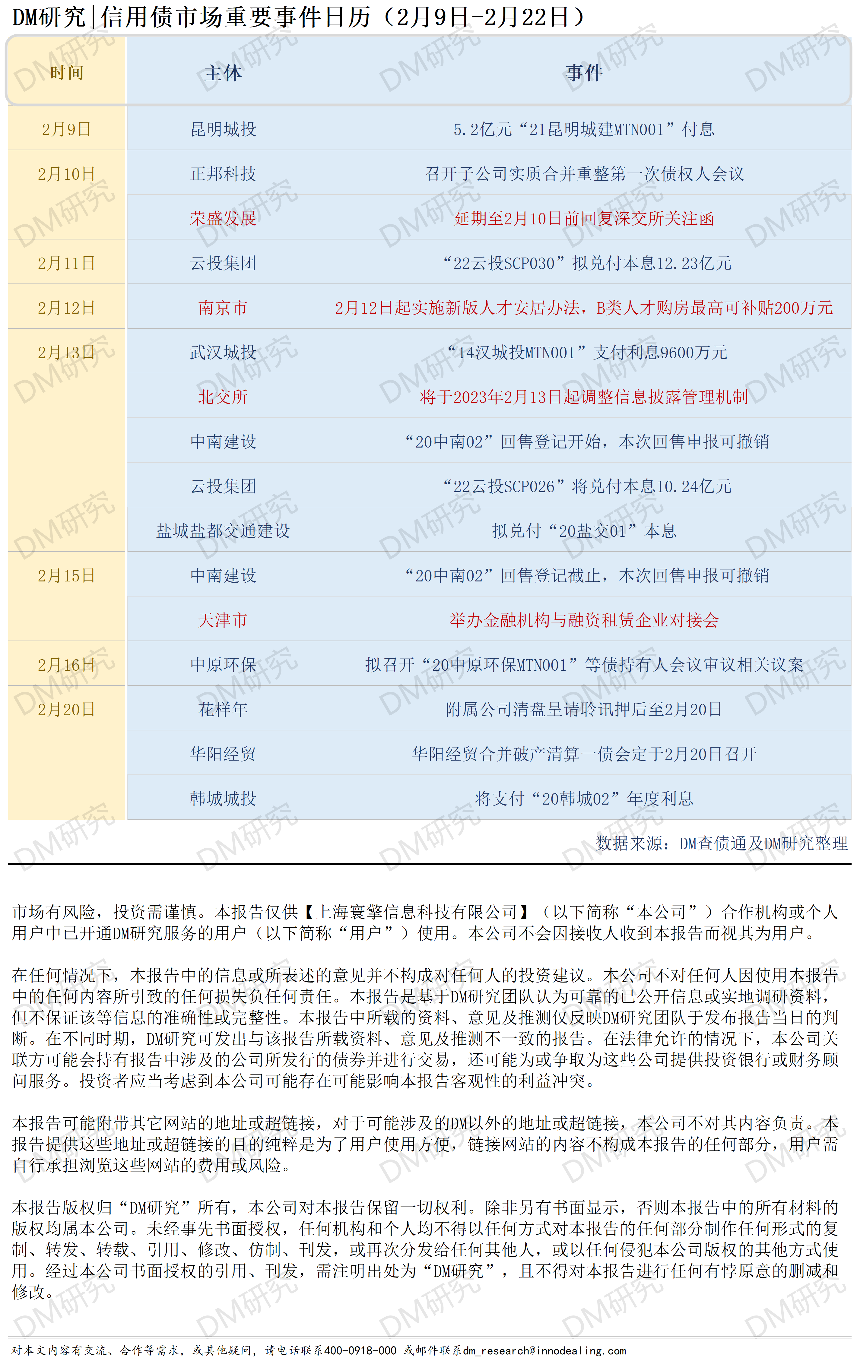 2023年2月9日至2023年2月22日,信用债市场需重点关注的部分事件包括: