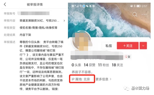 此外,关于这个投诉人,也有点儿意思。力场君看了一下,这位投诉人在头条号上还没有发表过什么内容,IP属地也是在北京,这位女士为远在廊坊市的荣盛发展奔走呼吁,也是让力场君深怀敬意;但就提出的几条认为力场君“侵犯名誉/商誉”的理由,可能还是牵强了点儿。