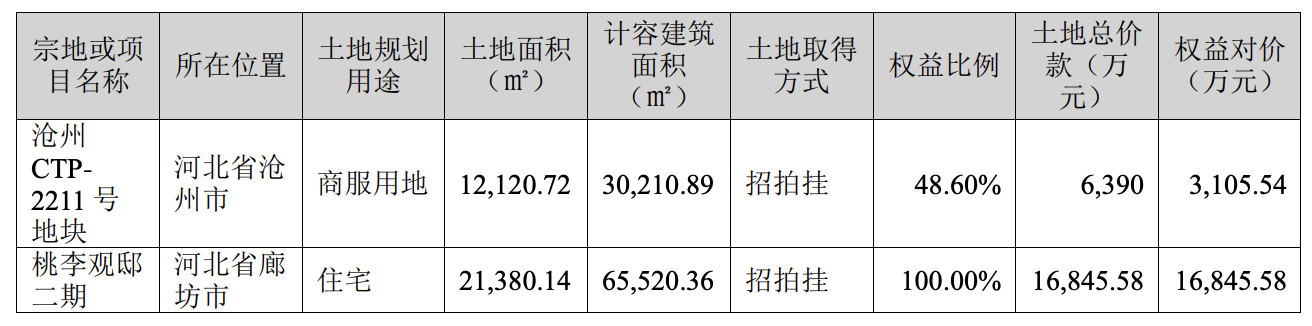 2022年荣盛发展仅新增了两宗土地储备项目,分别位于河北省沧州市和廊坊市。