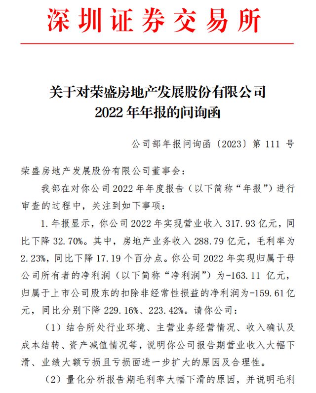 2023年5月10日,深交所对荣盛发展下发年报问询函,要求公司“说明报告期营业收入大幅下滑、业绩大额亏损且亏损面进一步扩大的原因及合理性”、“是否存在流动性风险”、“公司持续经营能力是否存在重大不确定性”、“相关审计意见是否恰当、合规”,等等。
