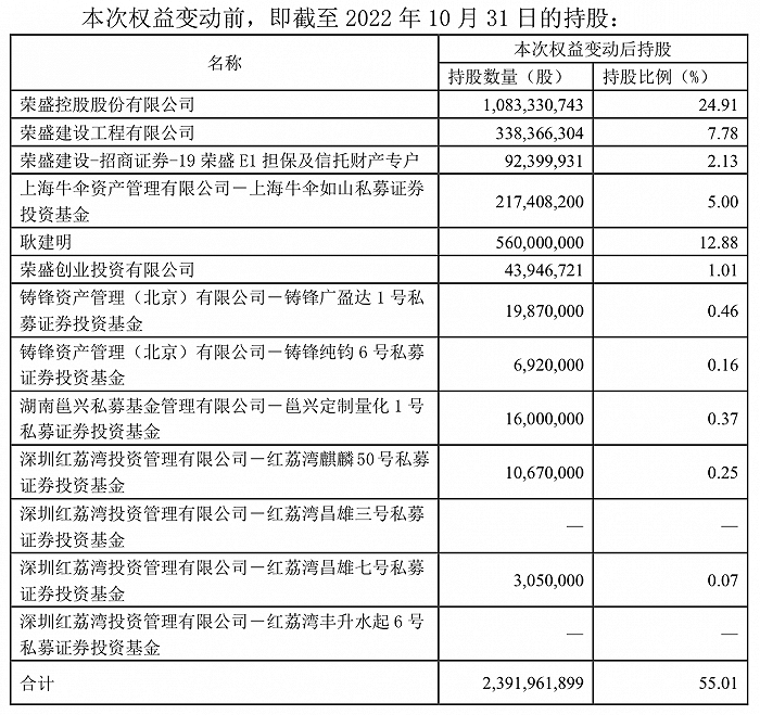 不仅仅如此,据7月22日披露的简式权益变动报告书,湖南邕兴私募基金管理有限公司-邕兴定制量化1号私募证券投资基金因业务发展需要及资本规划而进行的大宗减持,铸锋资产管理(北京)有限公司-铸锋广盈达1号私募证券投资基金因业务发展需要及资本规划而进行的大宗减持,铸锋资产管理(北京)有限公司-铸锋纯钧6号私募证券投资基金因业务发展需要及资本规划而进行的大宗减持,深圳红荔湾投资管理有限公司-红荔湾昌雄7号私募证券投资基金因业务发展需要及资本规划而进行的大宗减持,深圳红荔湾投资管理有限公司-红荔湾昌麒麟50号私募证券投资基金因业务发展需要及资本规划而进行的大宗减持,上海牛伞资产管理有限公司-上海牛伞如山私募证券投资基金因业务发展需要及资本规划而进行的大宗减持,以及上海牛伞资产管理有限公司-上海牛伞如山私募证券投资基金因与荣盛控股签署《一致行动人协议之终止协议书》解除一致行动人关系而导致的一致行动人持股数量的减少。