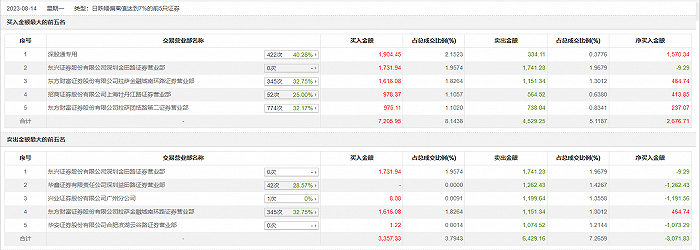 具体来看,东兴证券深圳金田路证券营业部、华鑫证券深圳益田路证券营业部分别卖出1741.23万元、1262.43万元;深股通专用、东兴证券深圳金田路证券营业部分别买入1904.45万元、1731.94万元。