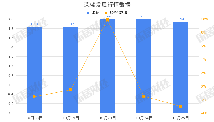 截至10月25日,荣盛发展(002146.SZ)股价收盘2.00元,跌-3.00%,成交总额4.24亿元,总市值84.35亿元。