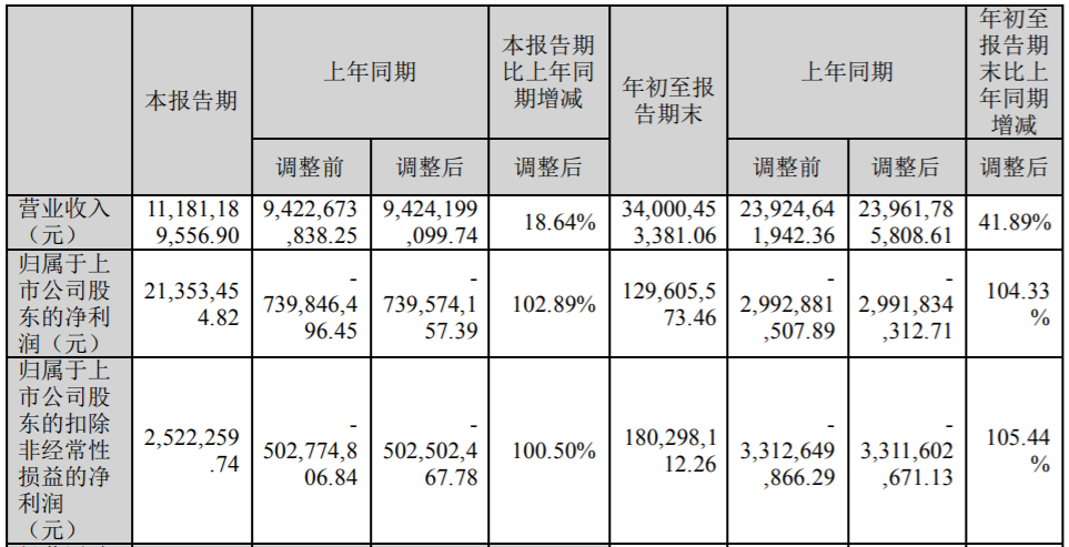 今年第三季度,荣盛发展实现营业收入约为111.81亿元,同比增加18.64%。1-9月,实现营业收入约为340亿元,同比上涨41.89%;归属于上市公司股东的净利润约为1.29亿元,同比大增104.33%;扣除非经常性损益后的净利润约为1.80亿元,同比上涨105.44%。