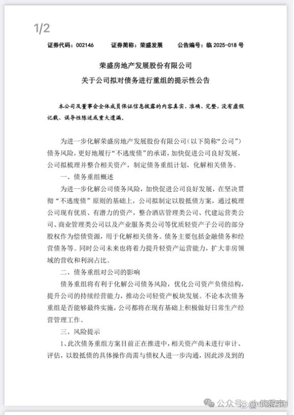 3月25日,荣盛发展(002146.SZ)公告称,公司拟对债务进行重组。