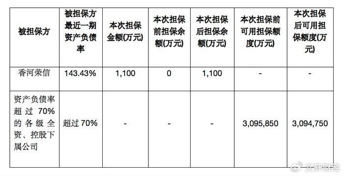 公告显示,荣盛发展全资子公司香河荣信房地产开发有限公司(以下简称“香河荣信”)向香河县财信城市投资控股集团有限公司进行专项资金借款本金1,000万元,由荣盛发展为上述业务提供抵押担保及连带责任保证担保,担保总额不超过1,100万元,担保期限不超过44个月。