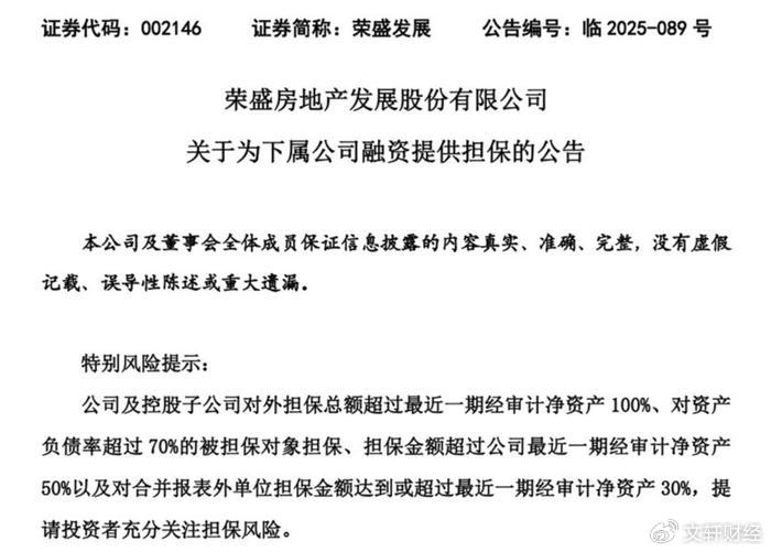 近日,荣盛房地产发展股份有限公司(以下简称“荣盛发展”,002146.SZ)发布了关于为下属公司融资提供担保的公告。