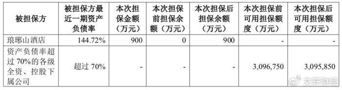 荣盛发展全资子公司滁州荣盛康旅旅游开发有限公司琅琊山荣逸山水酒店(以下简称“琅琊山酒店”)与滁州皖东农村商业银行股份有限公司丰乐支行拟继续合作,荣盛发展全资子公司滁州荣盛康旅旅游开发有限公司、南京荣盛康旅旅游开发有限公司、荣盛康旅投资有限公司为上述融资提供连带责任保证担保。担保本金总额不超过900万元,担保期限不超过48个月。值得关注的是,被担保方琅琊山酒店最近一期资产负债率为144.72%,远超70%。