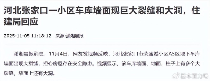 力场君还查了一下相关资料,张家口荣盛城项目于2018年建成、2023年6月交付,今年初就有网络信息提到地下车库墙体开裂,涉事楼栋共有28户居民,目前实际入住的有10户。