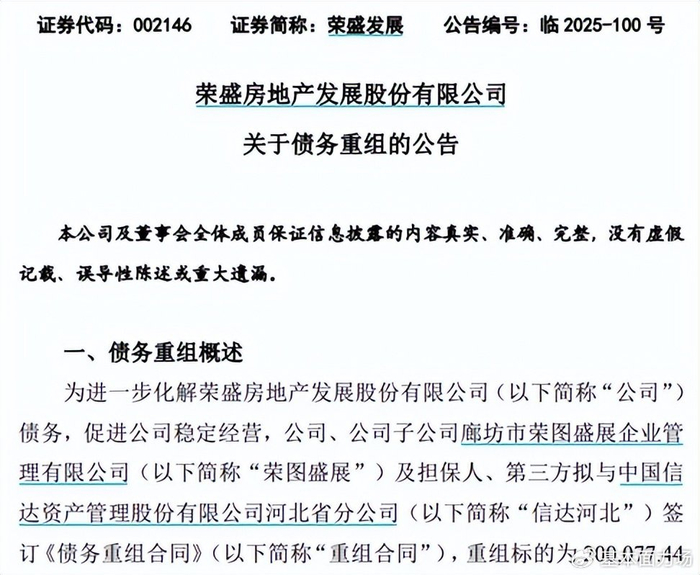 前些天一个周末,有个朋友问到力场君,怎么看 荣盛发展 (002146.SZ)这家公司?起因是11月17日晚间发布的一则《关于债务重组的公告》,披露引入信达河北分公司参与公司的债务重组,重组标的为20亿元,经协商后只需偿付10.5亿元,其中还包括3.5亿元的实物抵债。