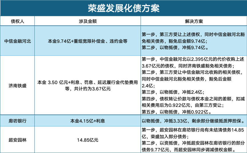 另一边,与济南铁盛的存续3.67亿元债务,荣盛则玩起了拆分术。先让中信金融河北以2.395亿元的代价收购上述债权并豁免部分,豁免后,债务瞬间“缩水”至2.4亿元,而这部分债务,同样由第三方接盘,继续以实物资产冲抵。