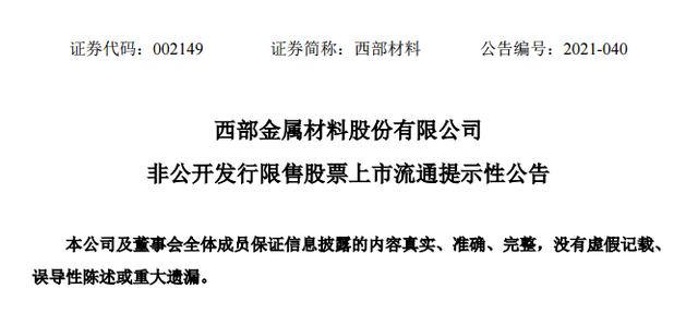 7月29日晚,西部材料(002149.SZ)发布定增解禁公告,公司向15名股东非公开发行的6280万限售股,占公司总股本的12.8632%,将于8月3日解禁上市流通。