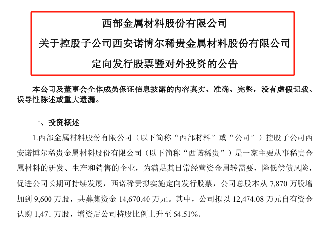 7月16日,西部材料公告宣布,控股子公司西诺稀贵将实施定增,总股本从7870万股增加到9600万股,共募集资金1.47亿元。