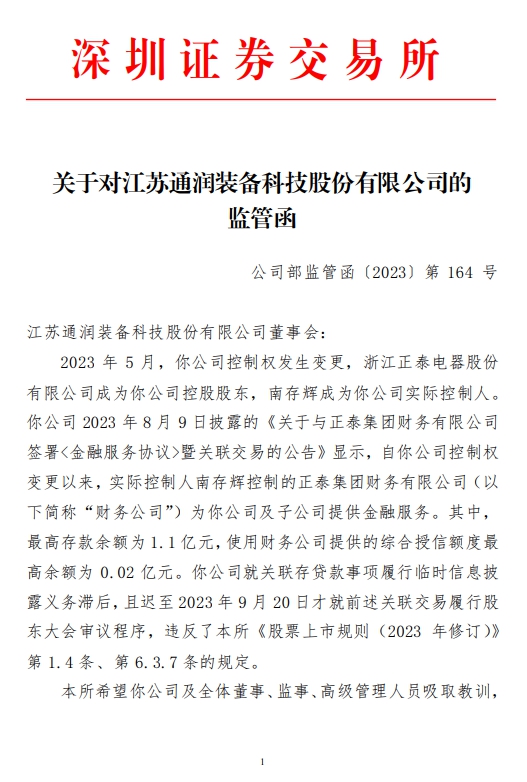 深交所表示,2023年5月,通润装备控制权发生变更,浙江正泰电器股份有限公司成为公司控股股东,南存辉成为公司实际控制人。公司2023年8月9日披露的《关于与正泰集团财务有限公司签署<金融服务协议>暨关联交易的公告》显示,自公司控制权变更以来,实际控制人南存辉控制的正泰集团财务有限公司(以下简称“正泰财务公司”)为公司及子公司提供金融服务。其中,最高存款余额为1.1亿元,使用财务公司提供的综合授信额度最高余额为0.02亿元。