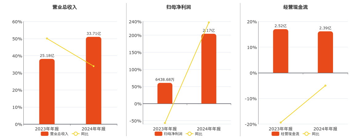 公司营业总收入为33.71亿元。归母净利润为2.17亿元。经营活动现金净流入为2.39亿元,较去年同报告期经营活动现金净流入减少1256.22万元,同比较去年同期下降4.99%。
