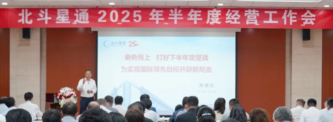 北斗星通董事长周儒欣在总结部署大会上发表题为《乘势而上打好下半年攻坚战为实现国际领先目标开辟新局面》的讲话。他对2025年上半年全集团经营工作进行了点评总结。他指出,今年上半年,集团上下“坚定信心守正出新奋楫再发力”,打了一场漂亮的攻坚战,取得了巨大的成绩。把公司推进了快速健康发展的新轨道、国际领先的新赛道、高质量发展的新阶段,形成了积极向好的“势”,为公司25周年献了一份大礼。