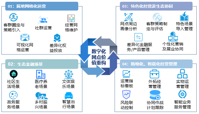 随着金融科技的快速发展,线下网点逐渐从原来集约化的业务服务定位中释放出来,且作为基础分销和服务窗口,在梳理服务品牌形象、销售复杂金融产品以及管理高端客户关系方面具有重要且不可替代的作用。因此,如何通过改变网点定位、重塑经营模式、融入金融生态、提升客户业务服务体验、加强周边客群精细化运营以及通过数字化手段优化经营管理效率成为当下网点数字化改造的关键点。