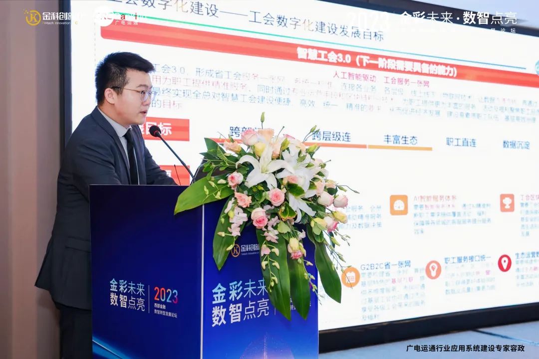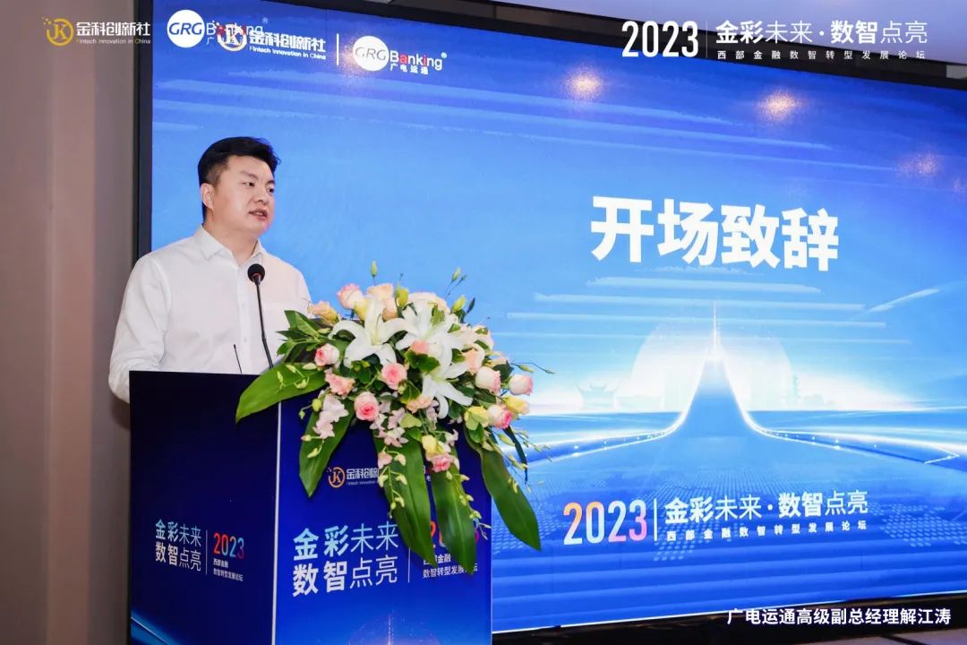在开场致辞环节,广电运通高级副总经理解江涛介绍,广电运通始终围绕客户进行战略升级,过去3年在政务、交通、教育等取得了一大批建设成果,在金融领域更是实现快速发展,业务范围逐渐扩大,在数字人民币、网点智慧建设、渠道融合建设等方面打造了一系列典型案例。