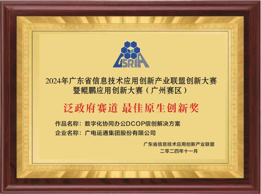 近日,广东省信息技术应用创新产业联盟创新大赛暨鲲鹏应用创新大赛2024(广州赛区)圆满落幕。大赛以“数智未来,因你而来”为主题,由广东省信息技术应用创新产业联盟、广州数据集团以及华为技术有限公司共同举办,广电运通凭借其“数字化协同办公DCOP信创解决方案”,在泛政府领域荣获“最佳原生创新奖”。