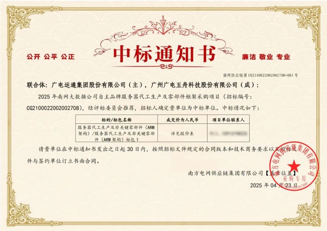 近日,由广电运通作为主体、成员企业广电五舟组成的联合体成功中标2025年南网大数据公司自主品牌服务器代工生产及零部件框架采购项目。凭借在关键部件自主研发与国产化替代领域的深厚积累,广电运通、广电五舟在电力关键设施自主化替代领域取得突破性进展,进一步巩固在算力产业链中的关键地位。