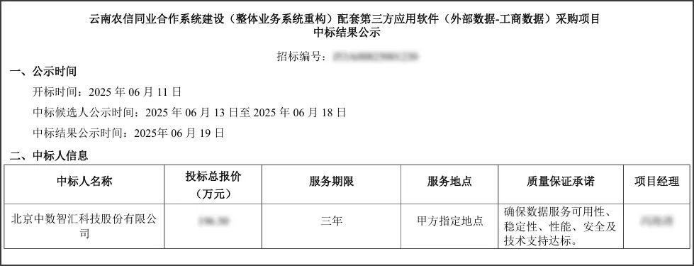 近日,广电运通成员企业中数智汇成功中标云南农信同业合作系统建设(整体业务系统重构)配套第三方应用软件(外部数据-工商数据)采购项目。此次合作是双方首次建立合作伙伴关系,接下来将以此为契机,共同探索企业信息服务的创新应用,助力云南农信提升业务风控能力、运营效率及数字化水平。