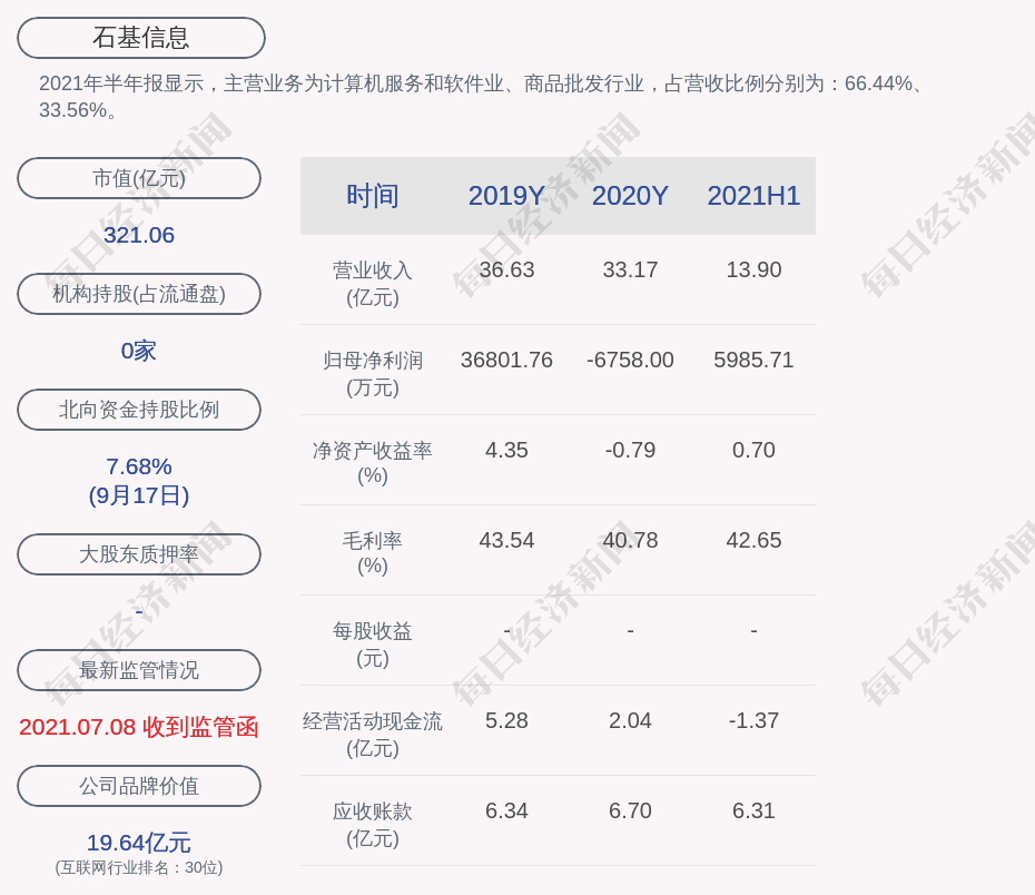 2021年半年报显示,石基信息的主营业务为计算机服务和软件业、商品批发行业,占营收比例分别为:66.44%、33.56%。