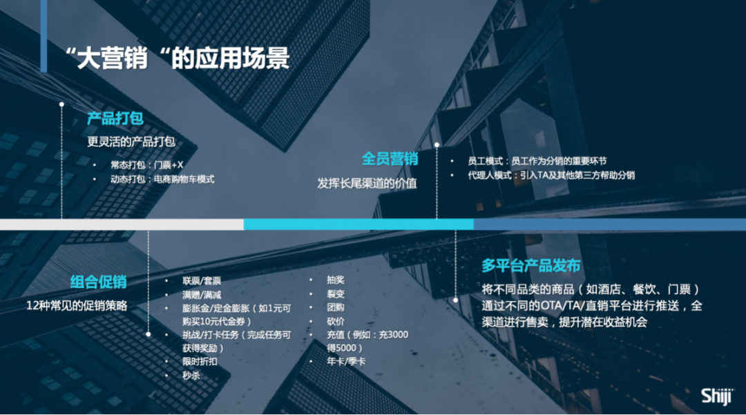 复合型文旅企业往往存在多个业态,且各业态间彼此割裂,无法形成统一营销和全面的会员体系。业务平台帮助企业从集团层面建立凌驾于各业态之上的统一营销部,并拥有产品、价格、渠道、品牌的营销权和控制权,实现了复合型产品打包、组合促销、多平台发布,这为文旅企业发挥了整合营销价值,为增收提供了坚实基础。