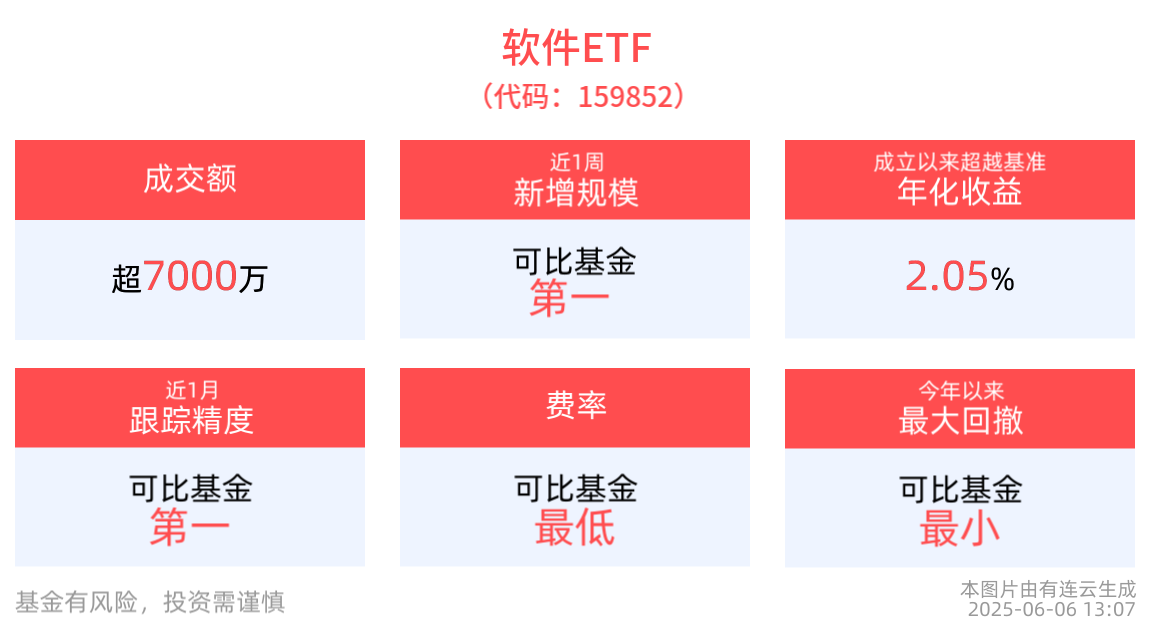流动性方面,软件ETF盘中换手2.69%,成交7795.40万元。拉长时间看,截至6月5日,软件ETF近1月日均成交1.69亿元,排名可比基金第一。