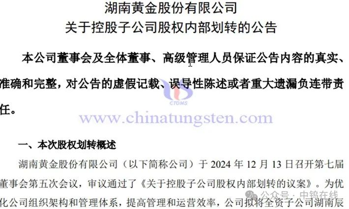中南锑钨92.02%股权拟无偿划转至湖南黄金公告