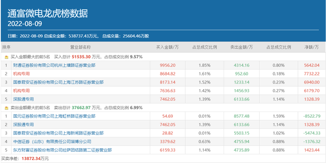 不仅如此,机构资金和北上资金当日也积极参与了通富微电的博弈,有两个机构专用席位分别现身该股买方第二和第四位,净买入金额合计为1.39亿元;深股通专用席位则同时出现在该股买方第五和卖方第二位,买入金额为7462.05万元,卖出金额为6133.66万元。值得注意的是,8月8日也曾有一个机构专用席位出现在通富微电买方第二位,买入金额为7744.85万元。