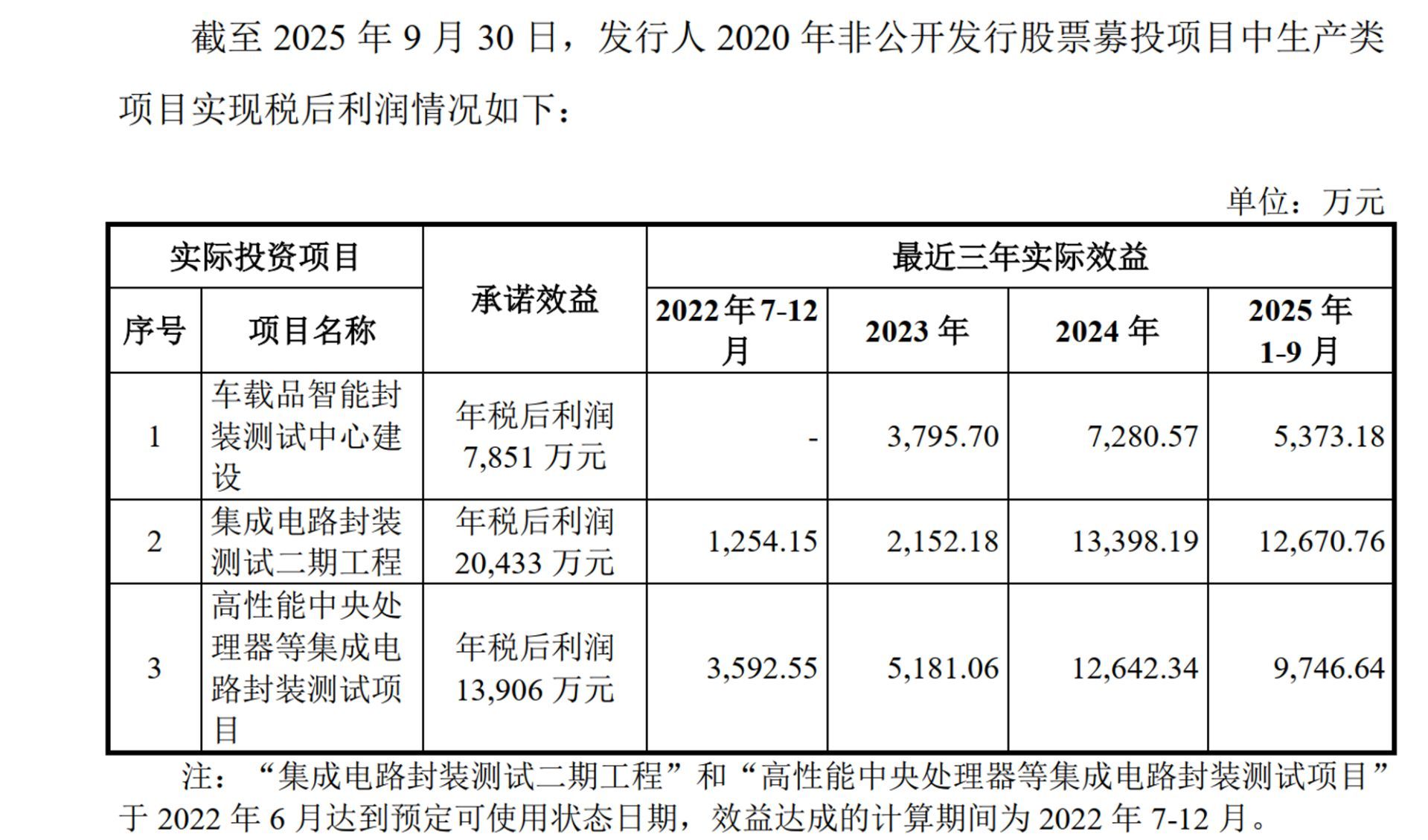 从具体数据来看,“集成电路封装测试二期工程”原本预计的年税后利润约2亿元,但在2022年7月至12月投产初期仅实现1254.15万元利润,2023年全年也仅为2152.18万元。同样,“车载品智能封装测试中心建设”项目预计年税后利润为7851万元,但实际在2023年和2024年分别实现3795.7万元和7280.57万元利润,均未达到预期基准线。“高性能中央处理器等集成电路封装测试项目”的预计年税后利润约1.39亿元,而该项目在2023年和2024年分别实现约0.52亿元和1.26亿元利润。