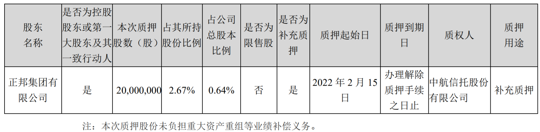 公告显示,公司于2022年2月16日接到公司控股股东正邦集团有限公司的通知,获悉其将所持有正邦科技的2000万股股权办理了质押手续,占正邦科技总股本比例为0.64%。