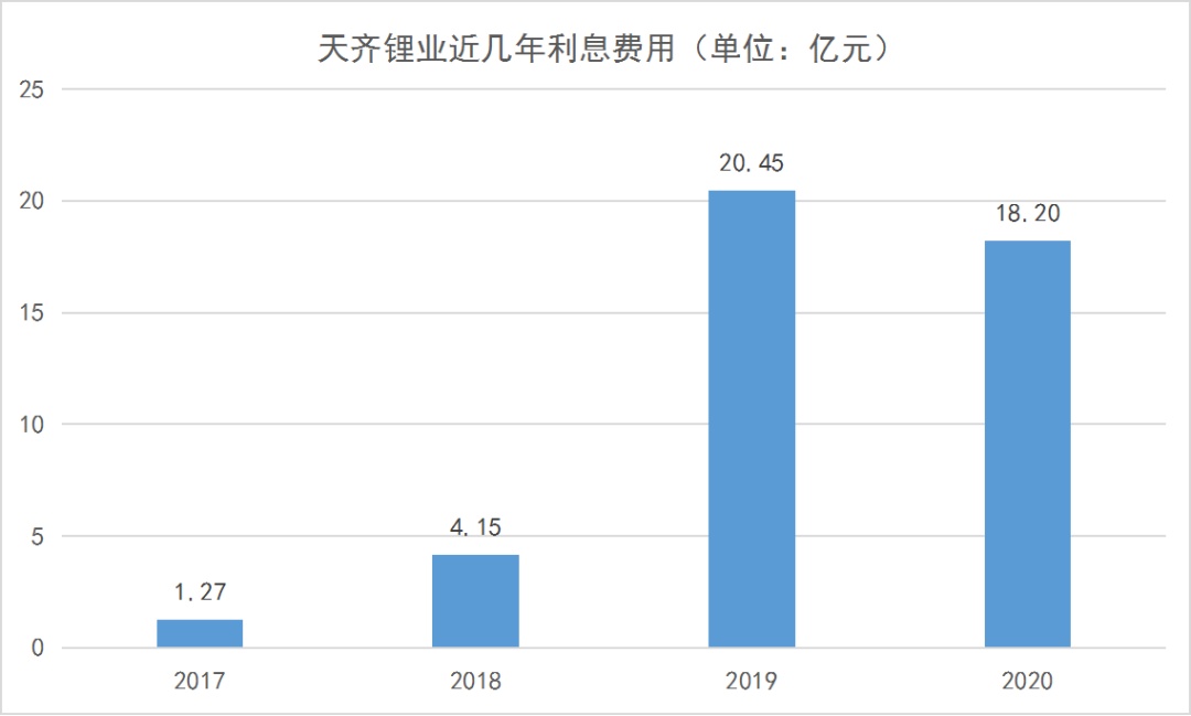 2018-2020年,公司这三年营收从62.4亿下降到48.4亿再到32.3亿,净利润从2018年的22亿转为亏损59.8亿和18.3亿。与之形成强烈反差的是,2018年时天齐锂业的利息费用还只有4.15亿,而到了2019和2020年,利息费用飙升到20.50亿元和18.2亿,两年利息费用接近40亿,几乎等于营收的一半。