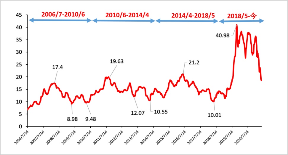 2006年以来,我国养猪行业大致经历了4轮“猪周期”。第一轮周期是2006年7月-2010年6月,第二轮周期是2010年6月到2014年4月,第三轮是2014年4月到2018年5月,最近一轮是2018年5月至今。也就是说,猪周期一次轮回大概是4年时间,其中下跌时间稍长于上涨时间。