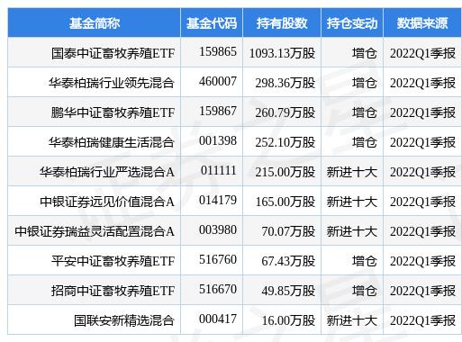 其中持有数量最多的基金为国泰中证畜牧养殖ETF,目前规模为24.32亿元,最新净值0.7471(5月19日),较上一交易日下跌1.49%,近一年下跌15.45%。该基金现任基金经理为梁杏。