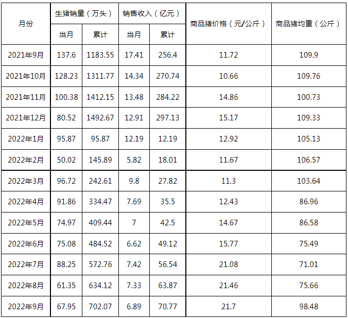 2022年1-9月,公司累计销售生猪702.07万头,同比下降40.68%;累计销售收入70.77亿元,同比下降72.40%。