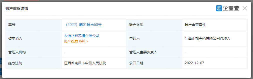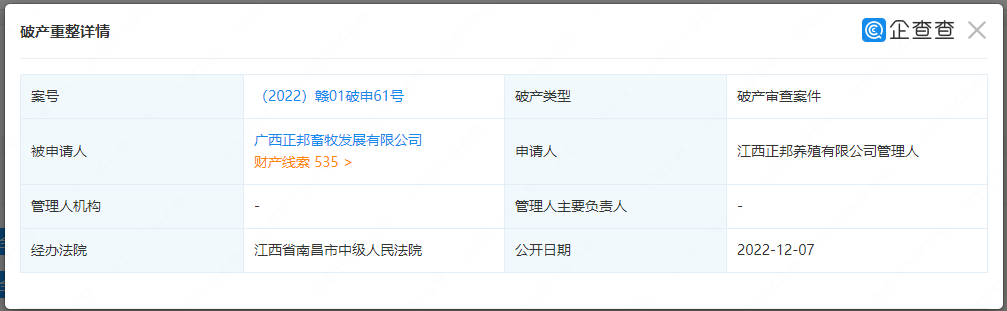 据网站显示,12月7日,江西正邦畜牧发展有限公司、大悟正邦养殖有限公司、崇左正邦畜牧发展有限公司、广西正邦畜牧发展有限公司、内江正邦养殖有限公司、四川正邦养殖有限公司共6家公司新增破产审查案件,申请人均为江西正邦养殖有限公司管理人,经办法院均为江西省南昌市中级人民法院。股权穿透信息显示,上述6家公司以及江西正邦养殖有限公司均由江西正邦科技股份有限公司控股。